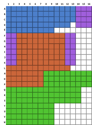 The figure to the right is the overall tile texture template. Pretty much all calculated tile textures (with the exception of #19—wooden platform, and #80—cactus) use a part of this template. There are four notable areas of the template. The first area, marked in blue is the "base zone". This zone is used by all tile textures. Wall textures are comprised of solely this base zone. The second area, marked in purple is the "blend zone". This zone is used by tiles that blend with dirt. The third area, marked in green is the "grass zone". This zone is used by grass textures. The final area, marked in orange is the blend/grass zone. This zone is used by both blend and grass textures.